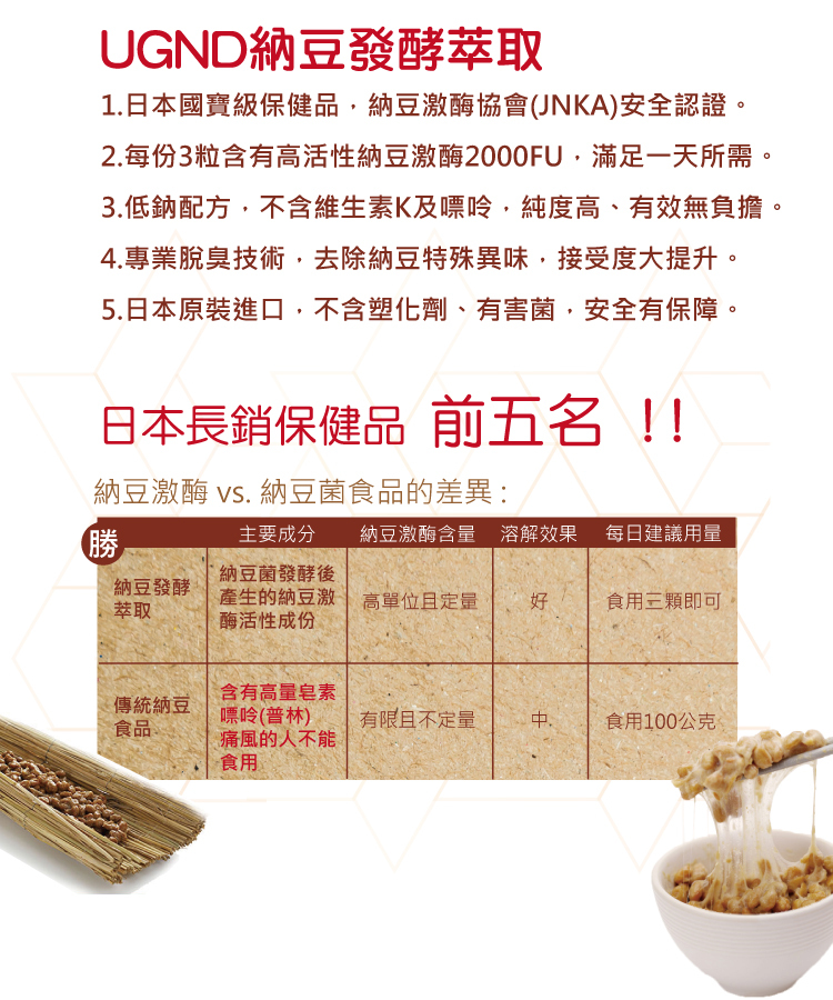 成分 :納豆發酵萃取物(含納豆激脢)、大豆萃取物(含卵磷脂)、黃豆油、蜂蠟、脂肪酸甘油酯、明膠、甘油