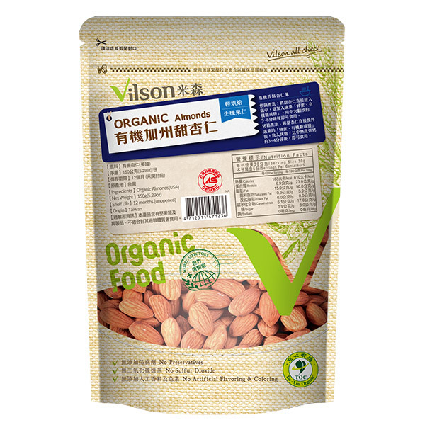 【米森Vilson】有機加州甜杏仁(輕烘培) (150g /包)