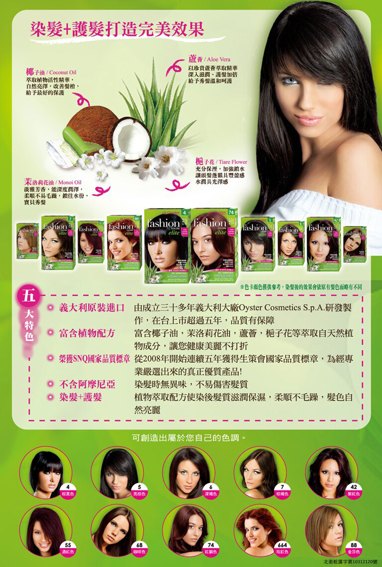 ★ 染髮+護髮一次完成 深層滋潤 ★染後秀髮散發淡雅芳香 ★呈現自然及豐盈之美麗髮色